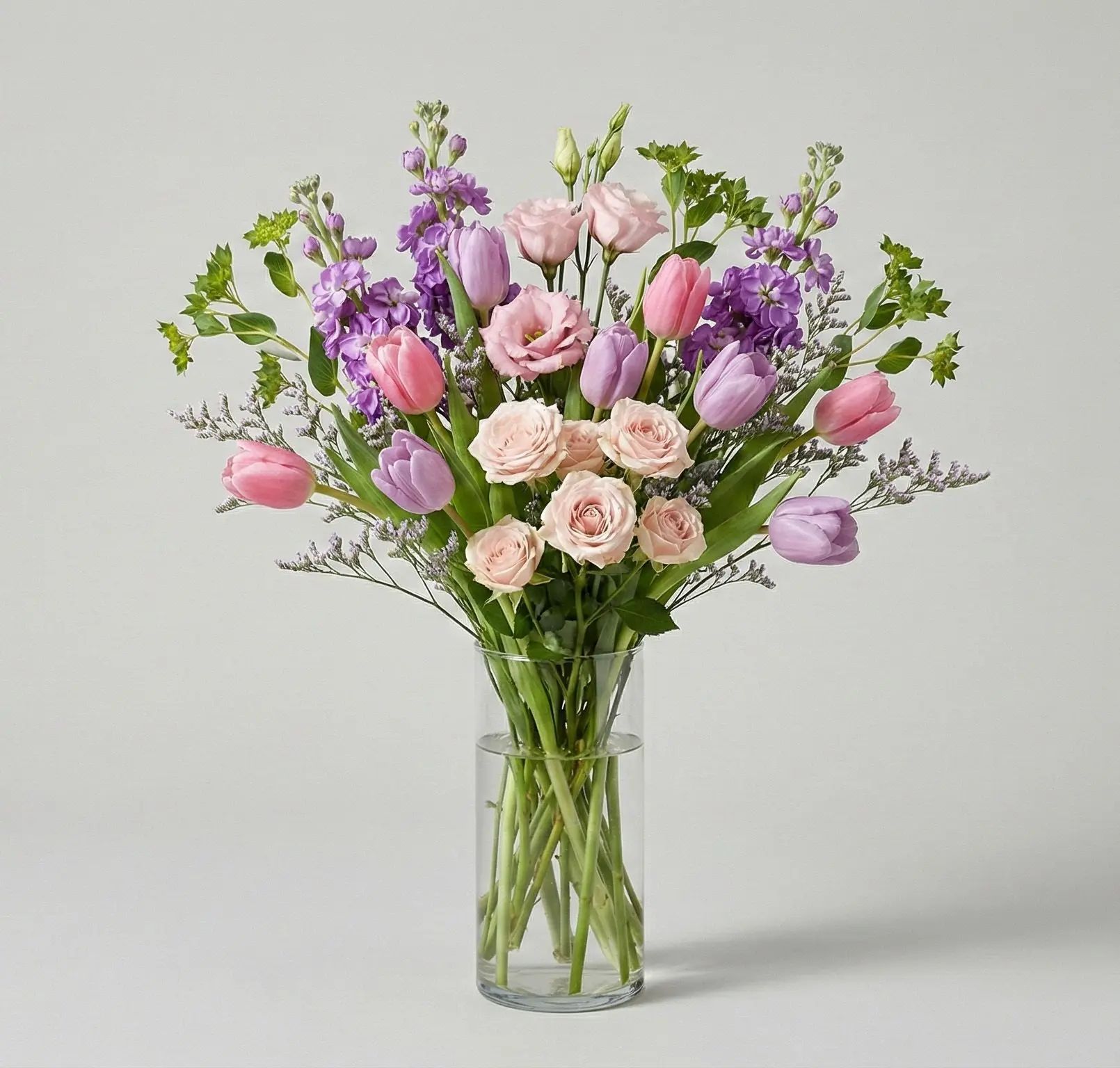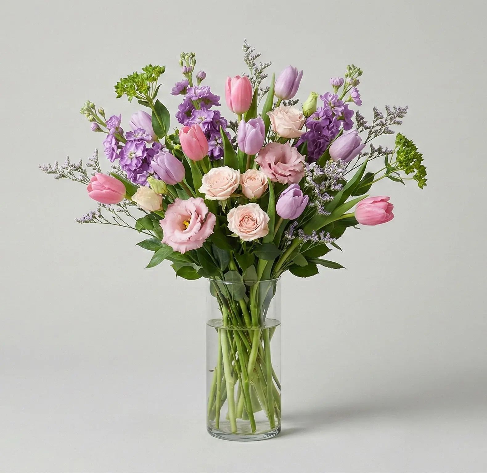 Immerse yourself in the delicate beauty of the Tulip Bliss Bouquet, a charming floral arrangement featuring pink and lavender tulips, soft pink spray roses, lisianthus, and accents of purple stock and limonium.