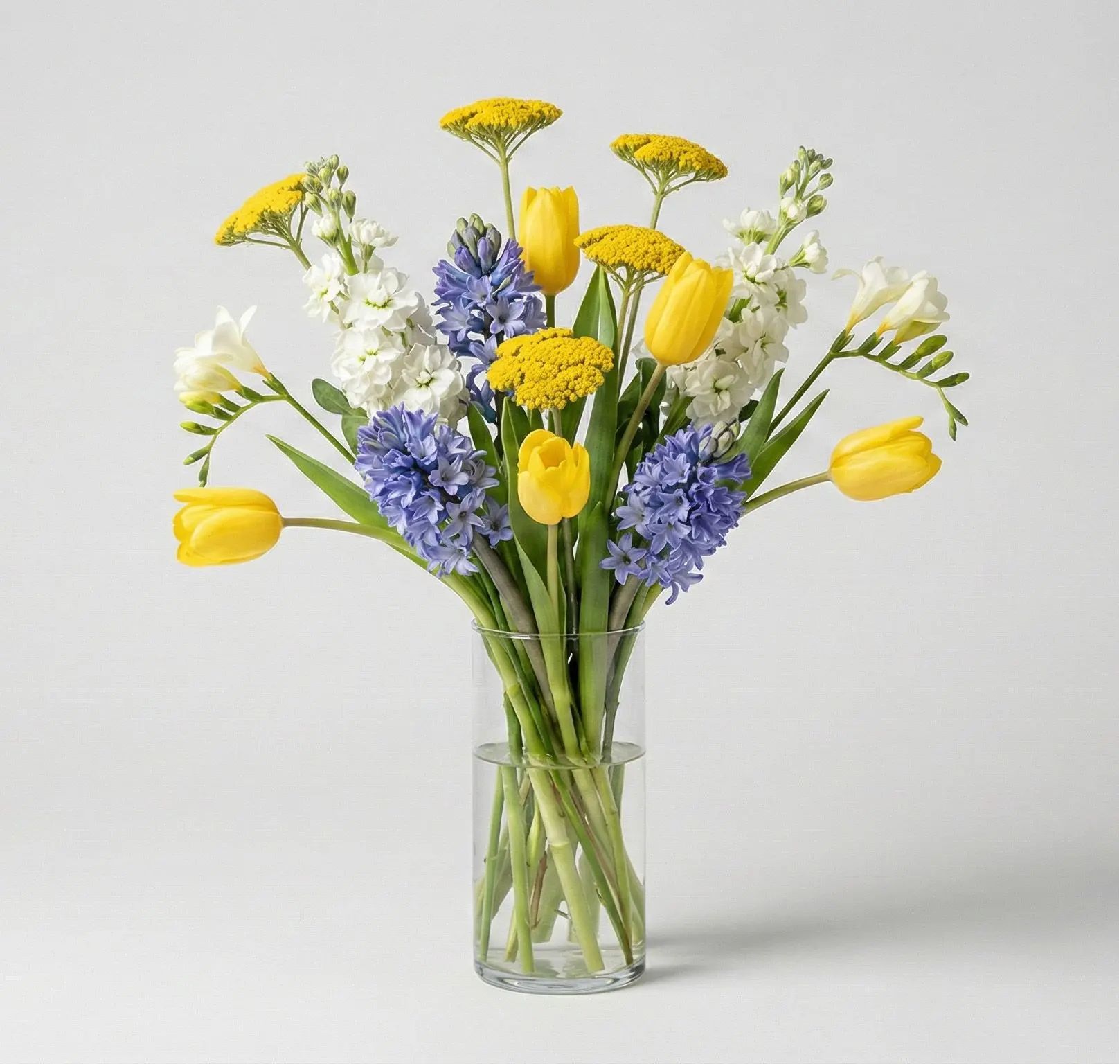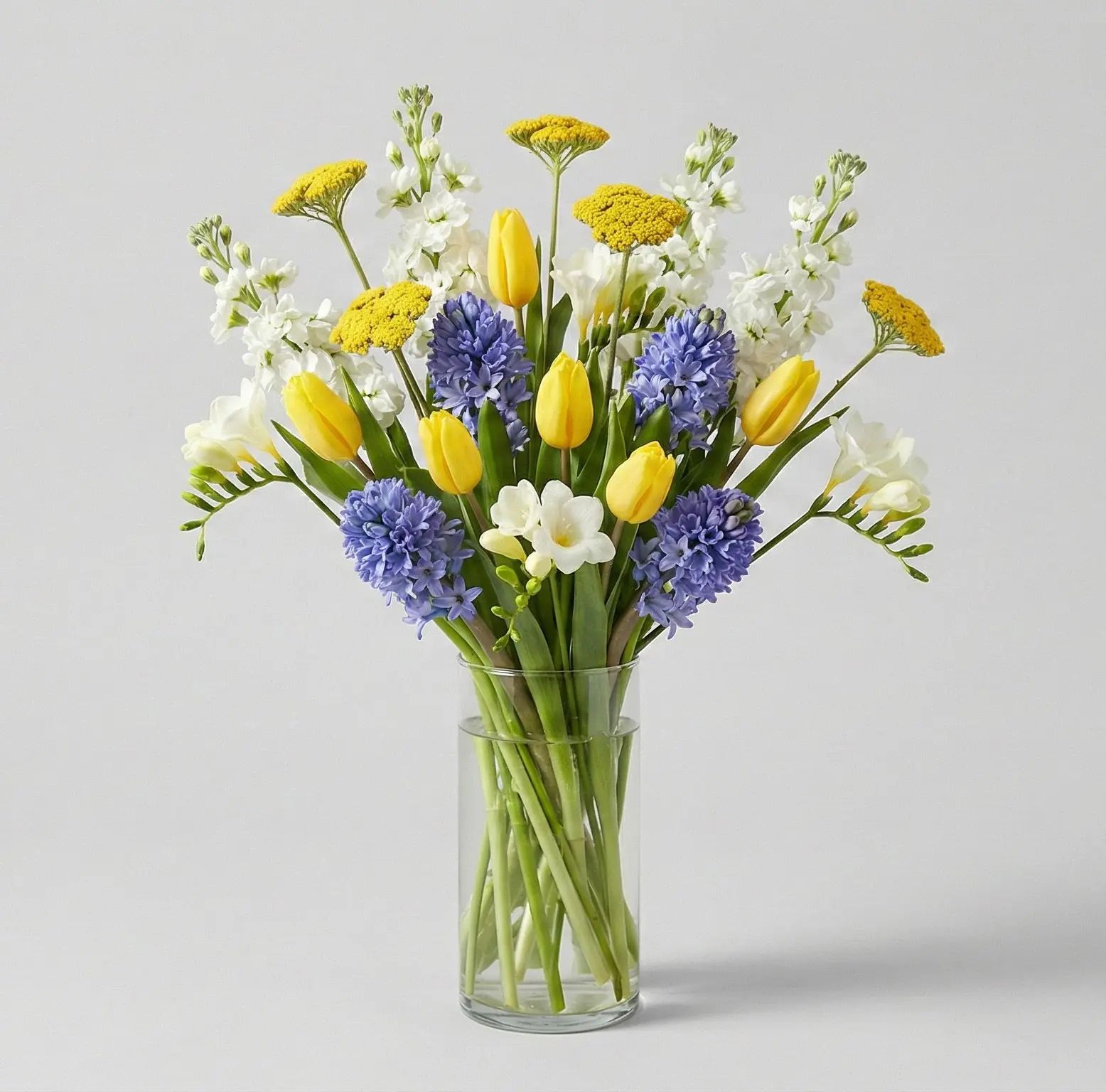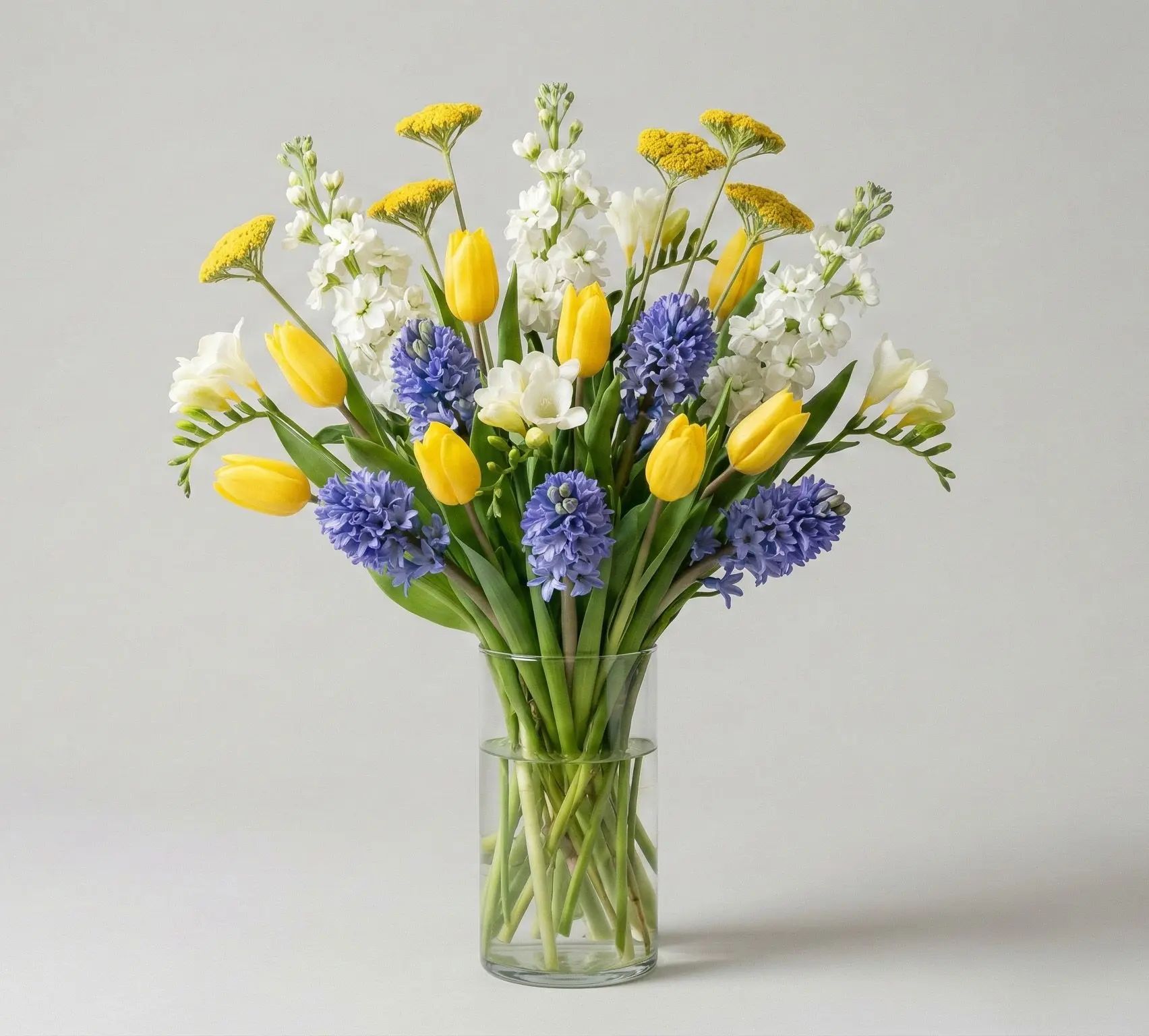 Sunlit Serenade is a joyful and fragrant bouquet that captures the spirit of spring with its radiant yellow tulips, fragrant blue hyacinths, and elegant white freesias.