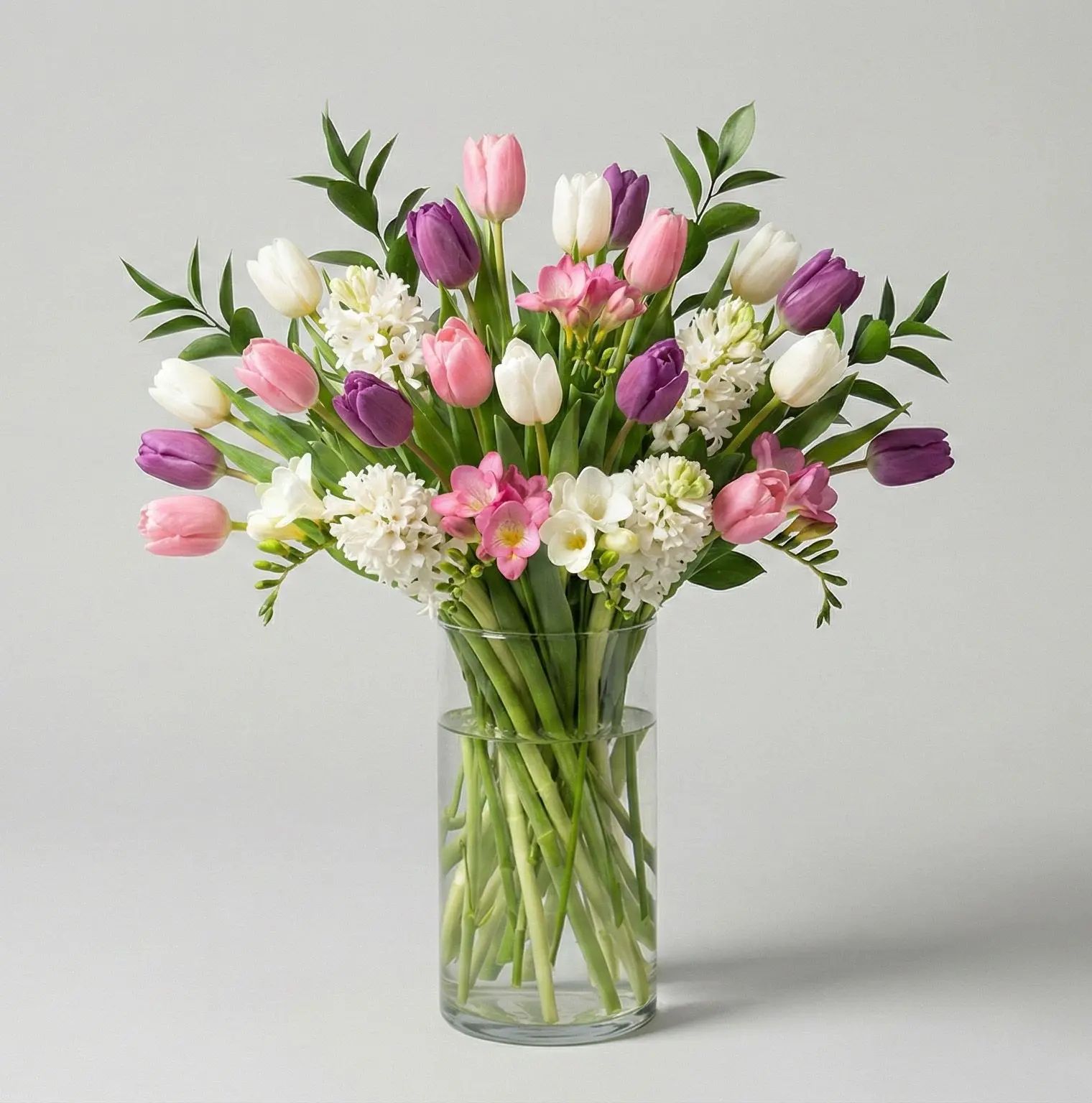 Whispers of Spring" blends pastel tulips, hyacinths, and freesias in soft pinks, whites, and purples, creating a vibrant, refreshing bouquet that brings the season's beauty and energy into any space with lush greenery.