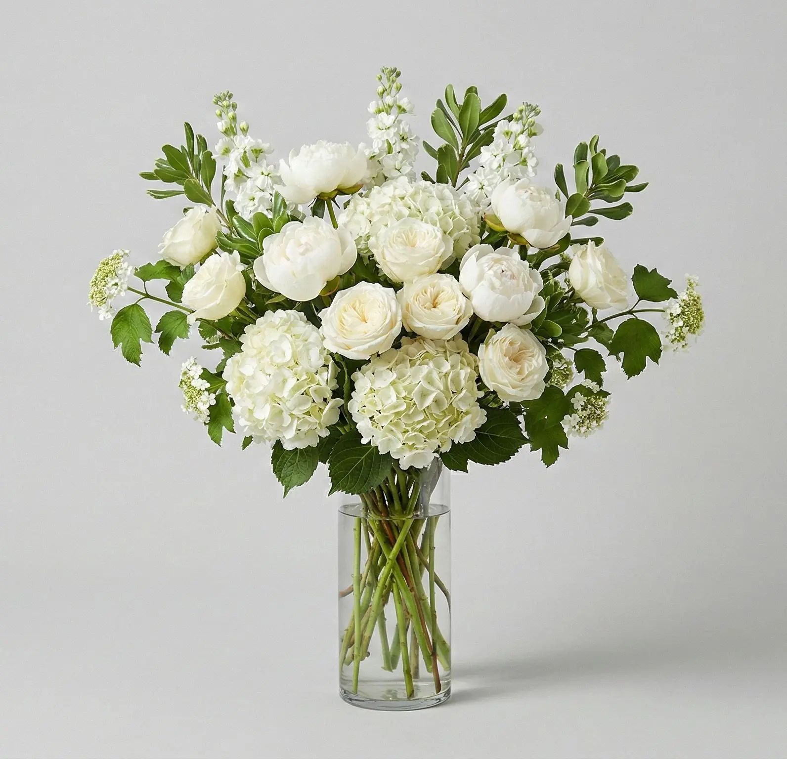 White florals with fresh green foliage; loose, garden-style composition.