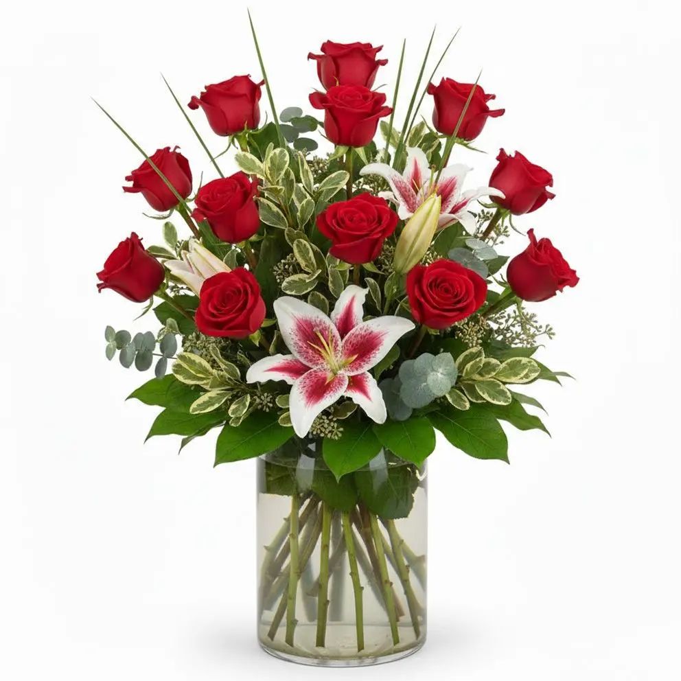 Celebrate life's precious moments with the captivating Ruby Radiance. Six vibrant red roses perfectly complement a graceful lily, surrounded by lush greenery. This stunning arrangement radiates warmth and joy, making it an unforgettable gift.